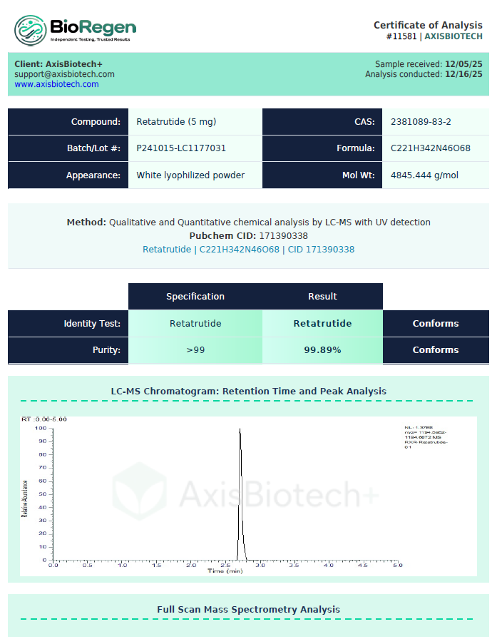 AxisBiotech+ prioritizes rigorous testing and full transparency for the research community. Each peptide is verified through comprehensive third-party analysis to empower reproducible, reliable research.